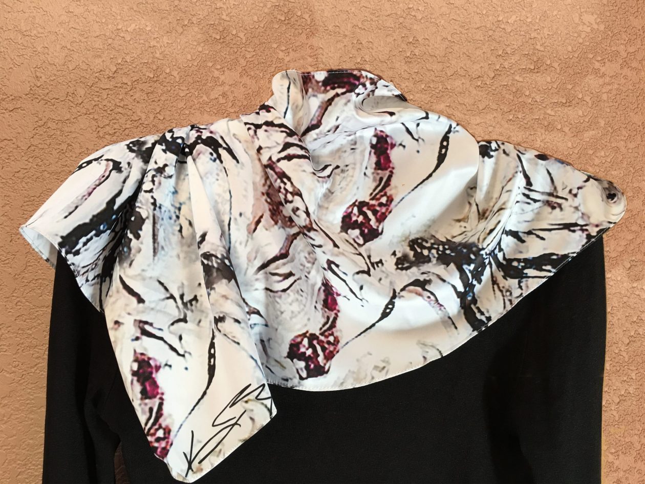 Colorful expression of flowing horses adorn this silk scarf.